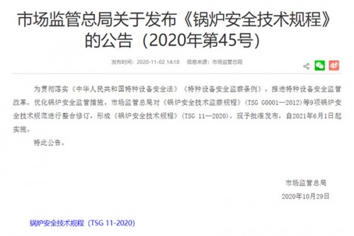 近日,市場監(jiān)管總局在官方網(wǎng)站上發(fā)布了《鍋爐安全技術(shù)規(guī)程》(TSG11-2020)的公告。該規(guī)程將于2021年6月1日正式實施,《鍋爐安全技術(shù)監(jiān)察規(guī)程》(TSG G0001—2012)、《鍋爐設(shè)計文件鑒…